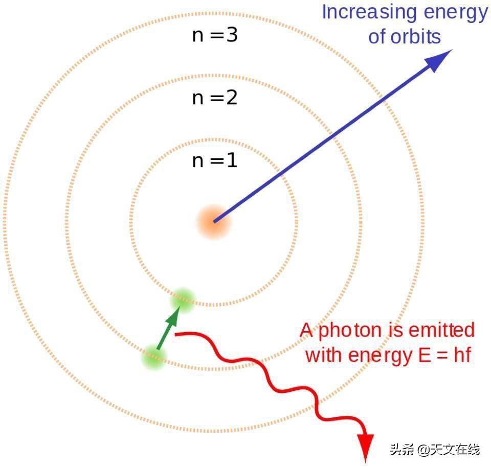 图解:当自由电子与氢原子核重新结合时,电子的能量等级会急速下降,发射光子。为了追求稳定,在早期宇宙中形成的中性原子,它们必须达到基态而不产生潜在的电离紫外光子。波尔德原子模型提供了一个粗糙的能量等级结构,但是这还不足以解释几十年前见到过的东西。(BRIGHTERORANGE & ENOCH LAU/WIKIMDIA COMMONS)