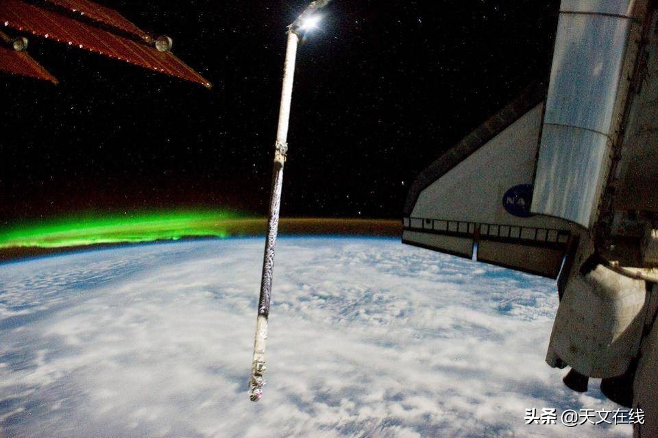 图为STS-114飞行任务期间,从发现号航天飞机看到的南部的灯光——南极光