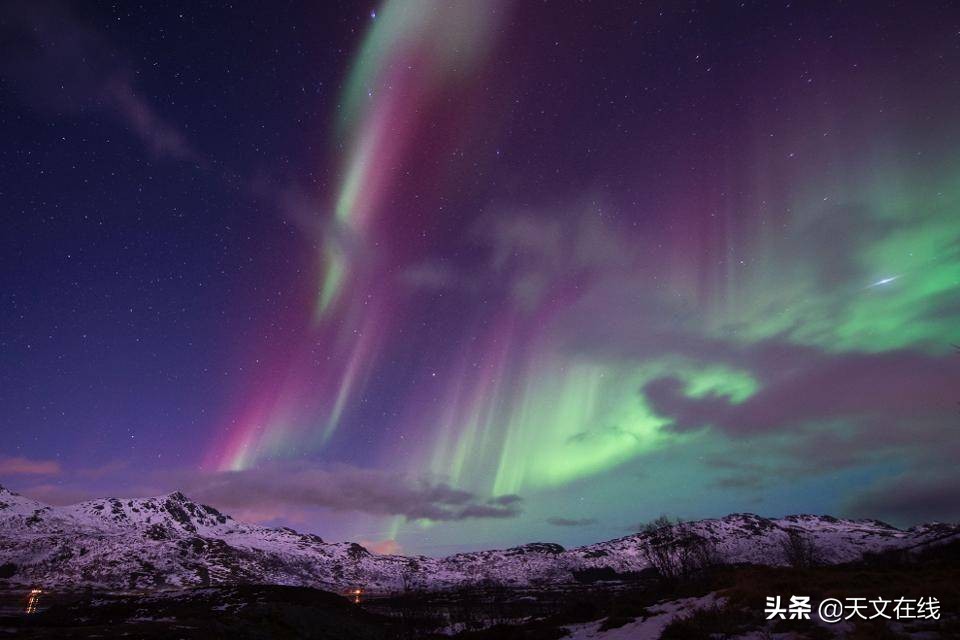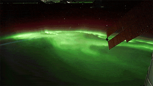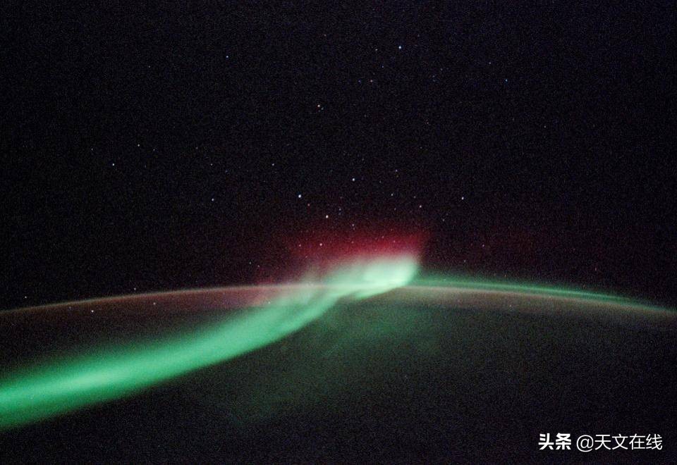 极光通常都是绿色的,它产生于大气层的最上层,距离地球表面由50、100甚至200公里更多。它们如波浪一般地落下,在天空中闪烁着,并在地球两极的附近形成成百上千英里的圆圈。从绕行地球的轨道,而不是地球表面的角度上来看,极光看起来是一道非常奇怪的、绿色的、燃烧着的火焰,它穿过了大气层的最外延和太空之间的边界。