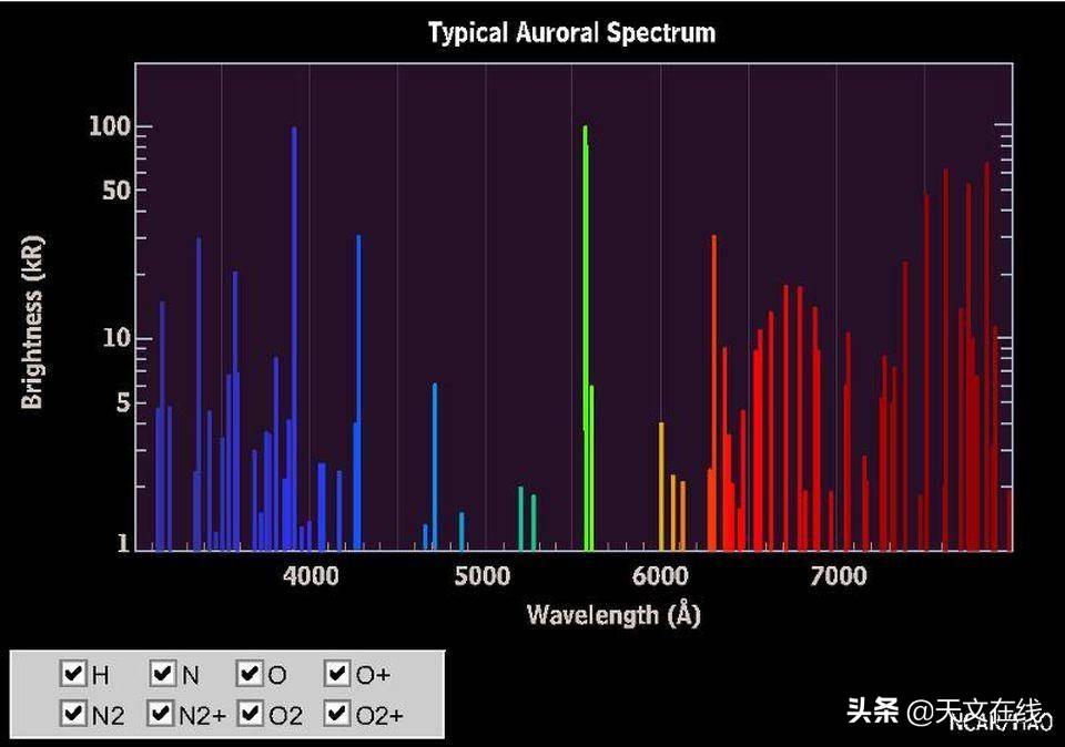 当自由电子最终找到与他们结合的离子的时候,它们的能量就会下降,从而创造出令人叹为观止的色彩多样性。在所有的这些大气的组成成份中,是氧气(是主要成份,在558纳米处有很强的发射线)和氮气(是大气中含量第二的成份,以一种较长的波长发射类似的射线)产生了一种和我们最常与极光联系在一起熟悉的、壮观的绿色,然而通常在更高的海拔,极光有时也有可能呈现出蓝色和红色,这是因为三种大气元素和他们之间的组合作用产生的结果。