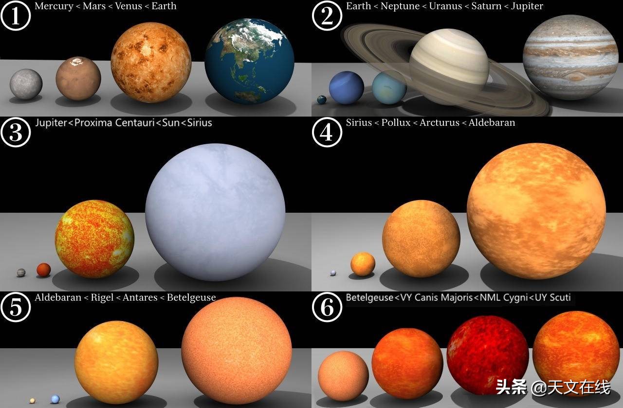 太阳系行星与大恒星的比较:(1)水星<火星<金星<地球;(2)地球<海王星<天王星<土星<木星;(3)木星<比邻星<太阳<天狼星;(4)天狼星<北河三<大角星<毕宿五;(5)毕宿五<参宿七<心宿二<参宿四;(6)参宿四<大犬座VY<盾牌座UY(图片来源:Wikimedia Commons/IStoleThePies)