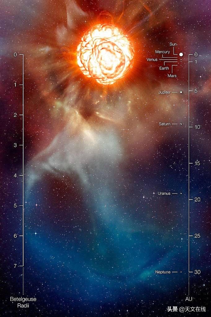 这张艺术家制作的图片展示了超级巨星参宿四,这颗恒星有着几乎和太阳系一样大的巨大气体羽流,其表面有一个沸腾的大气泡。图中还提供了以参宿四半径为单位的比例尺以及它与太阳系的比较。(图片来源:ESO/L.Calçada)