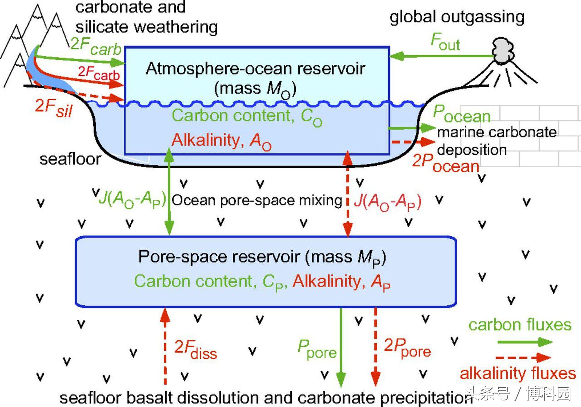 早期地球上碳循环的示意图,碳从大气进入海洋,最终成为海底含碳岩石的一部分,这些岩石经过风化,溶解了碳。图片:Creative Commons BY-NC-ND