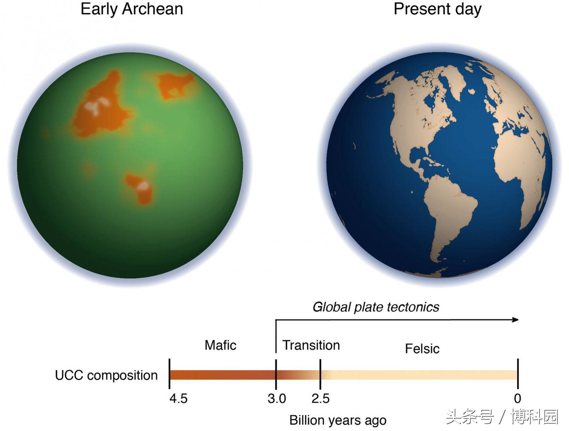 古代地球(左)和当今地球的比较。由于大量铁离子的存在,太古海洋呈现绿色。橙色的形状代表着富含镁的原始大陆,在板块构造时代之前。图片:Ming Tang/University of Maryland