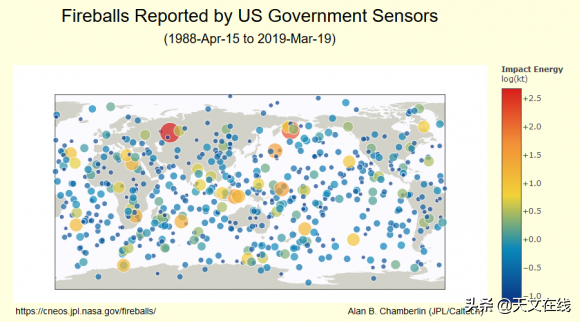 天体图显示了CNEOS(近地天体研究中心)探测到的流星爆炸的位置和能量。