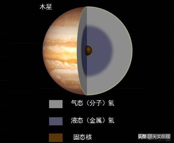 对于气体巨星,分析起来会更困难一些,因为它们不像岩石星体那样层次分明。另外,它们体型相当大,它们内部的高压高温是我们实验室无法模拟的,示意图我们只能依靠理论预测而不是实际数据去描述在那样环境下它们是由什么物质组成的。然而,我们还是可以确定木星和土星几乎完全由氢和氦组成,包含岩石和金属在内的绝大部分更重的物质必然已经沉入了内核中。但是实心核是否存在,内核的确切成分是什么?这些还很难说,因为我们几乎没有了解过如此高温高密度下的材料会有怎样的特性。