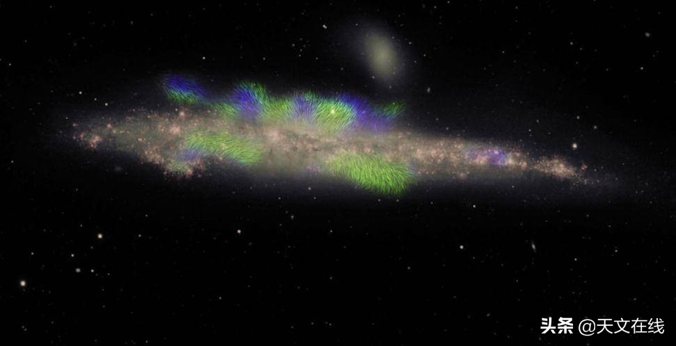 一张NGC 4631(俗称”鲸鱼星系”)的新图片,显示了星系圆盘上方和下方延伸的磁绳。在图片中以绿色和蓝色显示的磁绳,伸展到星系以气体和尘埃形成的光晕。绿色丝绳表示有着背离地球的磁场,而蓝色丝绳表示的磁场则指向地球。