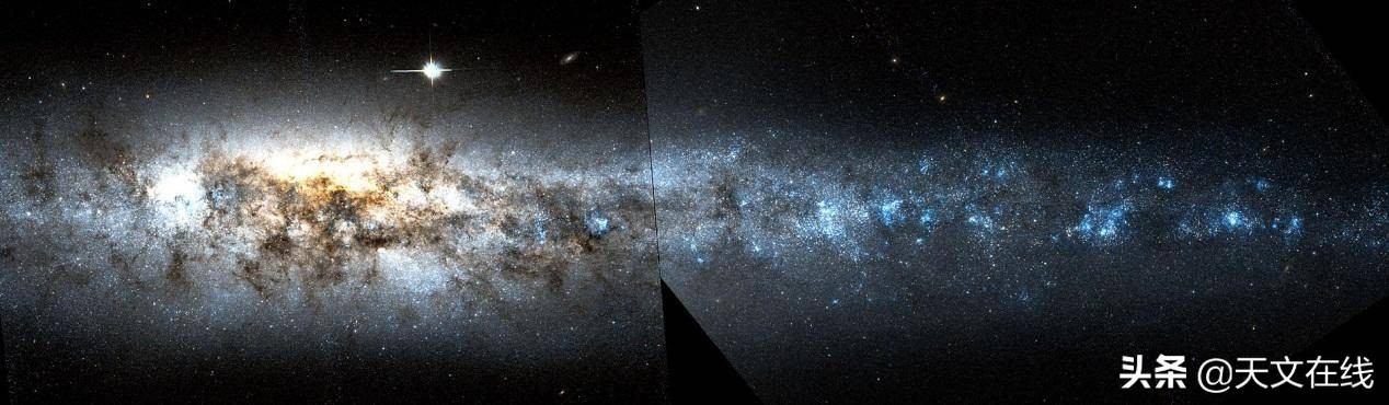 图解:两张哈伯太空望远镜的图拼接的NGC 4631,视野:7.2′x2′。