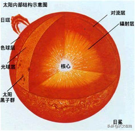 图解:太阳的内部结构分为核心、辐射层、对流层,大气结构分为光球、色球、和日冕。
