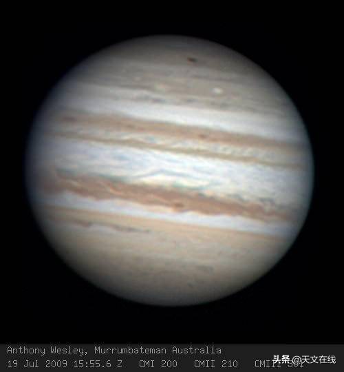 2009年7月19日拍摄的木星上的一个撞击疤痕。图片来源:安东尼·韦斯利。