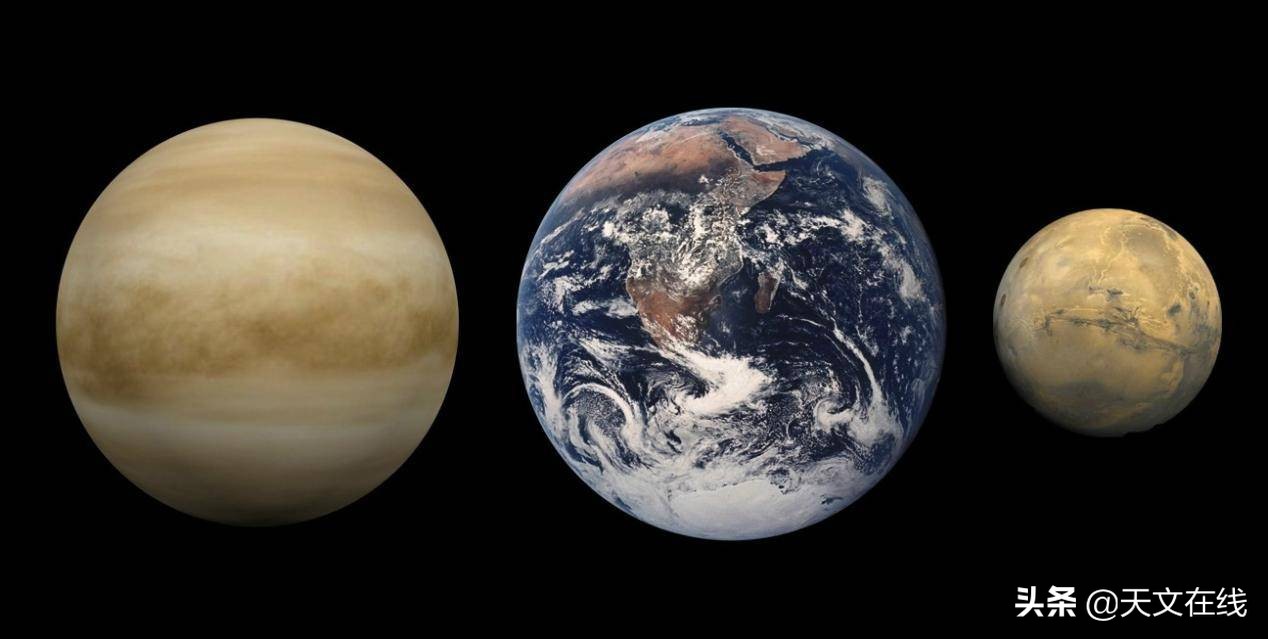 图解:如图为金星、地球、火星的体积对比。从左到右分别为金星、地球、火星。 图源:wikimedia