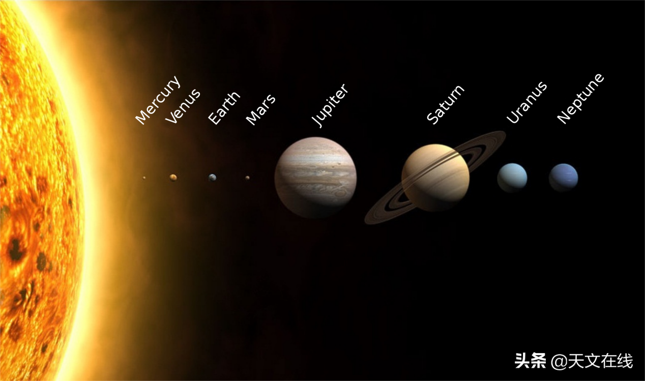 图解:太阳系中的行星分布图。上图中绕太阳旋转的行星按照距离太阳(Sun)的远近依次为:水星(Mercury)、金星(Venus)、地球(Earth)、火星(Mars)、木星(Jupiter)、土星(Saturn)、天王星(Uranus)、海王星(Neptune) 图源:wikipedia