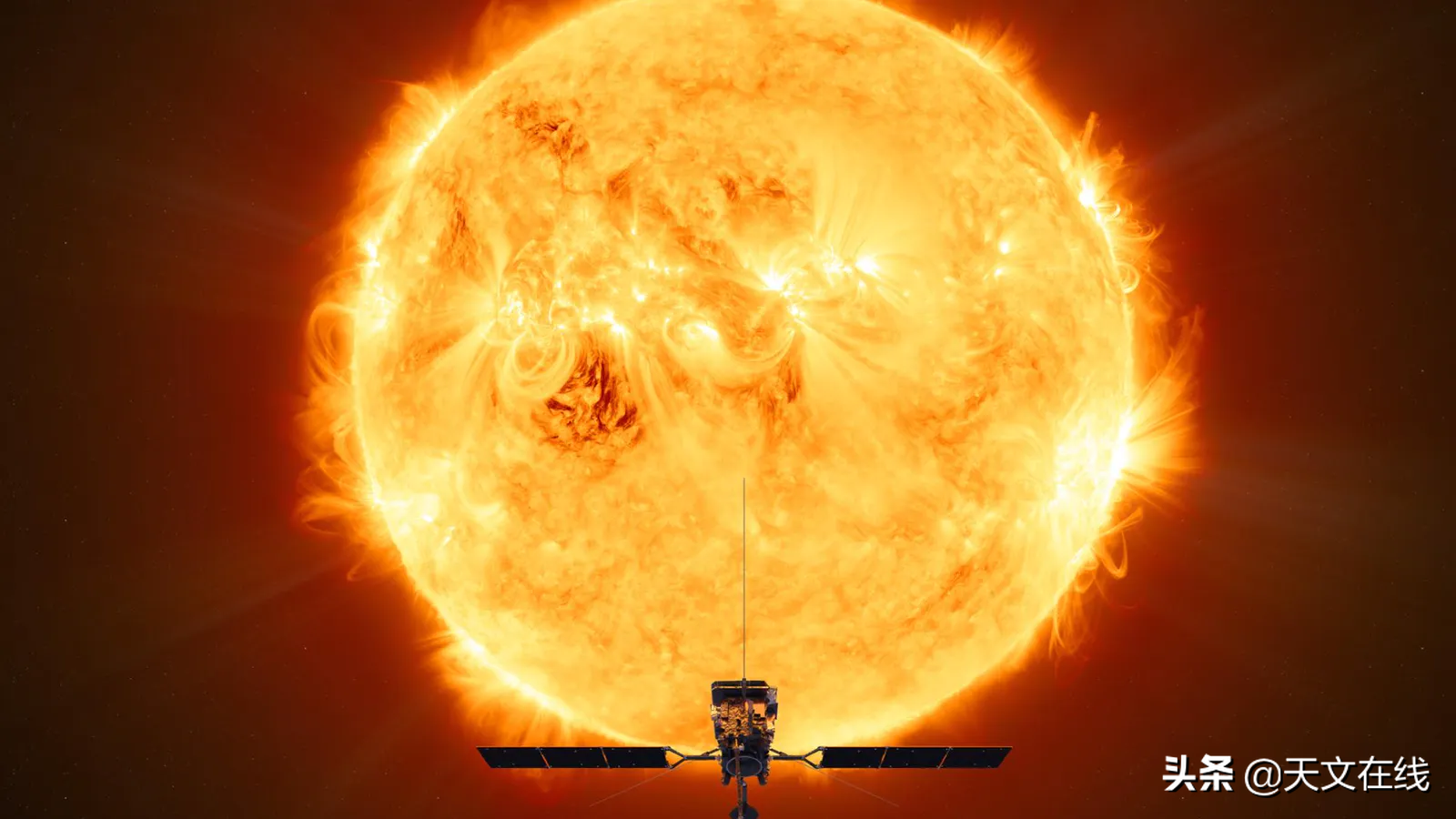 欧洲航天局的太阳轨道飞行器将首次拍摄太阳两极的直接图像(图片来源:航天器:ESA/ATG medialab;太阳:NASA/SDO/P.Testa(CfA))。