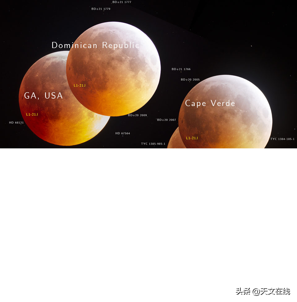 说明: 我们看的都是同一轮明月吗?没错,不过我们所见的月亮也都稍有不同。差异之一是在视觉上月亮相对于背景恒星的位置,这种效应称为视差。我们人类就是用二眼之间的视差,来判断物体的远近。不过要察觉月亮的视差,我们得比较更大间距、相隔数百到数千公里远的”眼睛“。另一个差异,则是世界各地所见到的球形月亮表面,都稍有不同,这种效应称为天平动。上面这幅呈现2019年1月21日月全食的组合主题影像,就结合了摄于多个地点,后来投稿到APOD的照片。这些照片全都投影到同一片背景星场,以阐释上述的这二个效应。这些照片之所以能够精准叠加,则受惠于月食期间,有颗陨石恰好撞击在L1-21J的位置,从而保证这些投稿照片取像的时间点,差异都在转瞬之间。