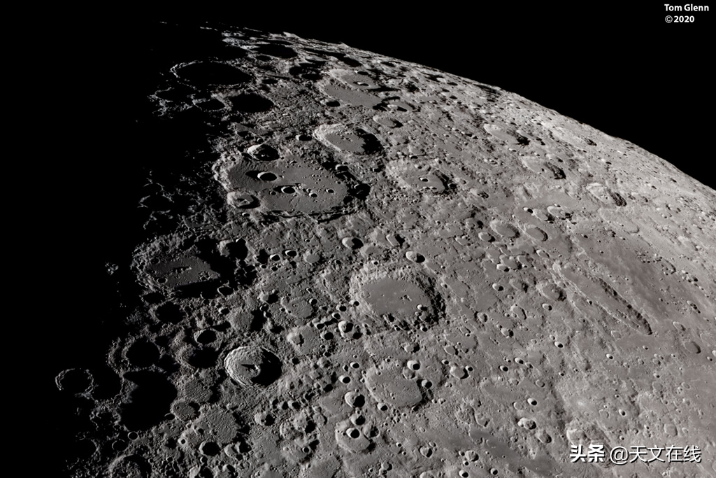 说明: 在这幅细致的望远镜影像里,月球的南极位在顶缘附近。这张记录月面崎岖南方高原的影像,摄于地球的南加州。在下弦月时,日落影子形成的月面明暗界线从左方接近。因为透视缩短效应,视觉上这片原野密布着大量的撞击坑,而且越近月球临边的撞击坑,形状越接近长椭圆。在影像左下,可见到坑墙耸立、直径85公里的第谷坑。年轻的第谷坑之中心峰仍沐浴在阳光中,并在坑底投下长长的影子。在第谷坑南方(上方)的大环形山,是直径231公里的克拉维斯坑。它的坑墙与坑底,叠着较晚近形成的撞击坑。位在影像顶缘月亮邻边的山峦,高耸出周边的原野约6公里。
