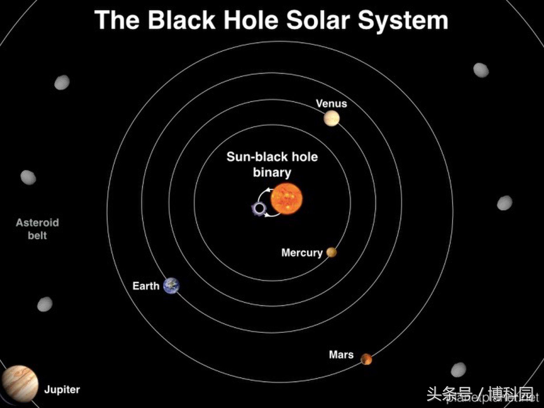 物理学课堂上常见的一个问题是,如果太阳被质量相同的黑洞所取代,会发生什么变化。答案是,行星的轨道不会改变——如果黑洞的质量和太阳一样,那么它的轨道将保持不变(在这种情况下,地球上的生命显然会受到缺乏光照和热量的影响)。如果太阳附近有一个质量相等的黑洞伴星——大约是一个天文单位(AU)的十分之一:那么太阳系行星的轨道不会有太大的改变。(一个天文单位是地球与太阳的距离——约9300万英里,即1.5亿公里)。尽管如此,假设这些行星与太阳保持相同的距离,太阳的引力和黑洞伙伴的引力将导致这些行星更快地完成它们的轨道,地球的年从365天减少到258天。在上面的场景中,太阳和黑洞每隔2.9天就完成一个轨道。这意味着地球从太阳接收到的能量将在太阳从离地球更近或更接近地球时的90%到110%之间波动。这就像是每2.9天在纽约和迈阿密之间来回奔波。
