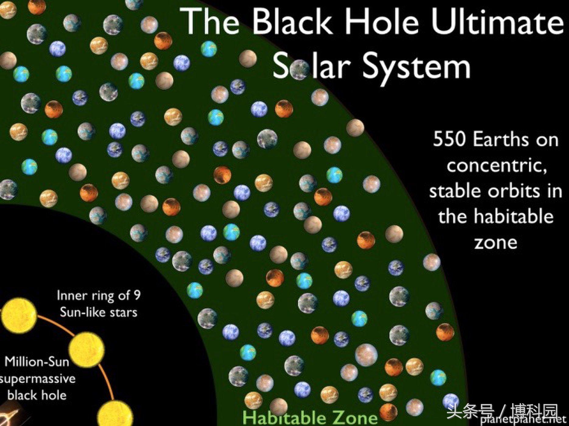 除了想象恒星质量黑洞周围的生活之外,还计算出了有多少可能适合居住的行星可能适合超大质量的黑洞,即太阳质量的100万倍。这几乎和银河系中心的那个一样大,这只会与太阳的直径有关。在太阳周围,行星运行的轨道只有在它们的引力作用压倒太阳之前才能如此紧密地结合在一起,从而导致不稳定的轨道。大约有六颗地球质量的行星可以在太阳的宜居带内保持稳定的同心圆轨道。相比之下,超大质量黑洞的引力异常强大,足以轻而易举地吞没行星。如果太阳被一个百万太阳质量的黑洞所取代,550个地球质量的行星就能在宜居带中保持稳定的同心圆轨道。超大质量黑洞的引力会更强地拉向每颗行星靠近黑洞的位置。这将把可居住区域的行星拉长,尽管它们离得不够近,无法被撕裂。