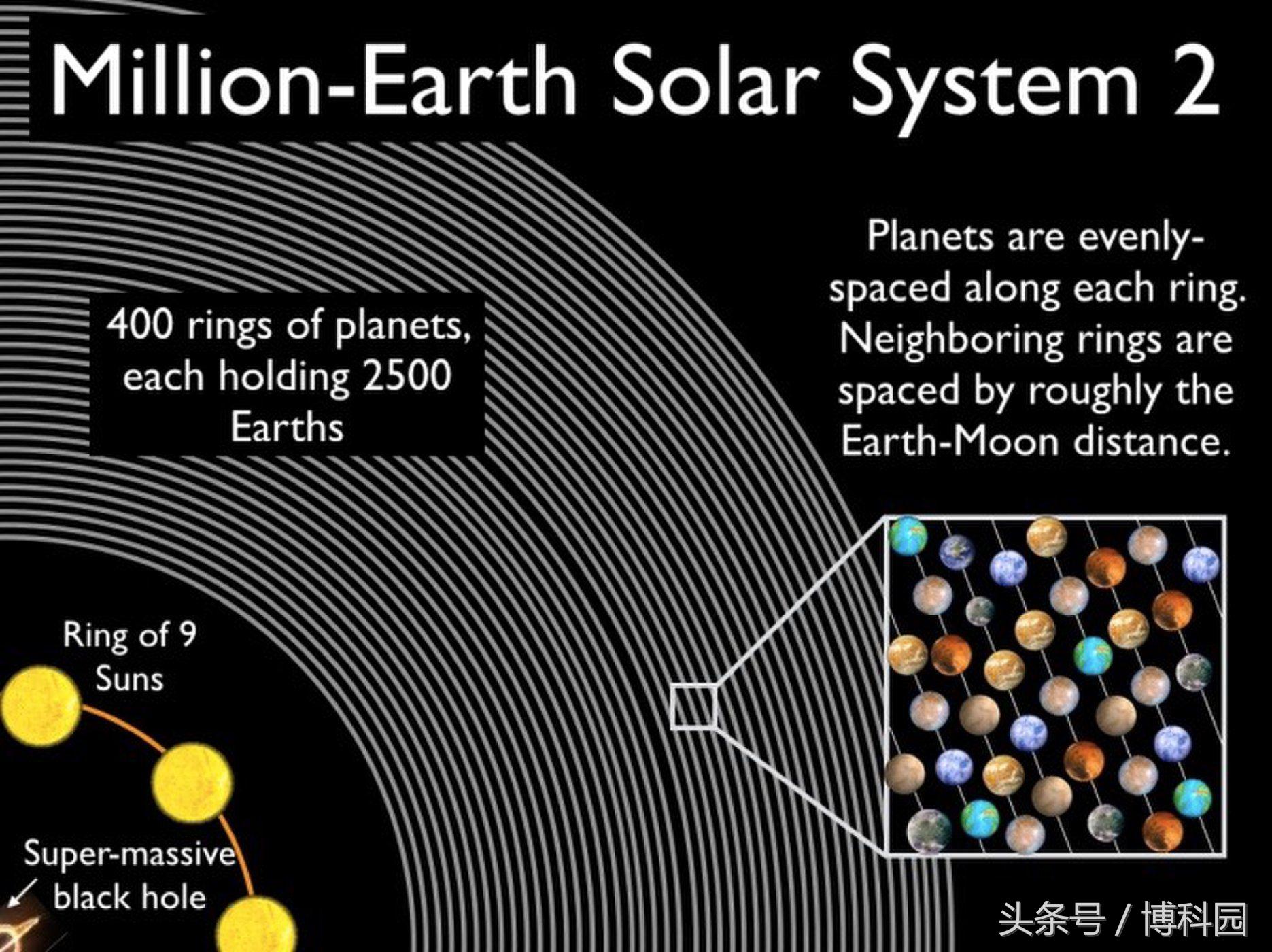 这个装置和拉里·尼文书中的‘环形世界’的区别在于,在这种情况下,行星之间没有可居住的表面积。这样的百万行星系统从何而来?雷蒙德说:“我可以想象,超级先进的外星人创造了一个系统,就像百万地球的太阳系一样,是一种宇宙艺术,有点像摩天大楼或彩绘冰山的艺术,在最宏伟的尺度上看看我们有多奇特。或者外星人可能会把这种系统建成动物园,他们可以有一个从最热到最冷的气候梯度,在整个宇宙中储存各种各样的生物。当然必须小心,不要把太空生物的错误组合放在同一个行星环上,因为那样不会有好结果。总的来说,想出所有可能存在的行星系统是很有帮助的,有些发现可以通过‘去那儿’和想象一些远远超出常规的可能性来预测,这些系统是科幻小说和“去那里”的结合,想做的主要事情就是努力突破我们认为可能的极限。
