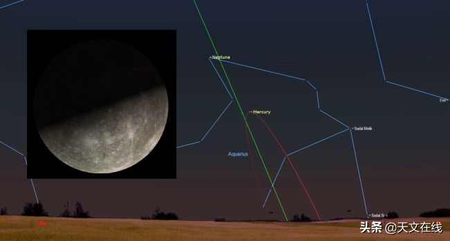 图解:2月10日(周一)晚上,水星(轨道显示为红色曲线)将达到其与太阳最宽距离,即太阳以东18度。由于水星位置处在近乎垂直的黄道之上,对于北半球观测者来说,这将是在2020年水星的最佳亮相时机。最佳观赏时间为当地时间下午6点至7点。用望远镜观测(如插图),这颗行星将呈现出一种晦暗无光的状态。(图片来源: Starry Night)