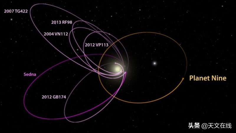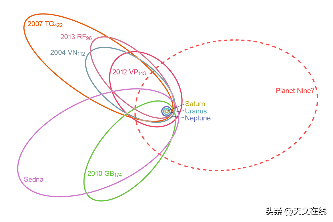 图解:对六颗海王星外天体的轨道统计导致了这个假说。