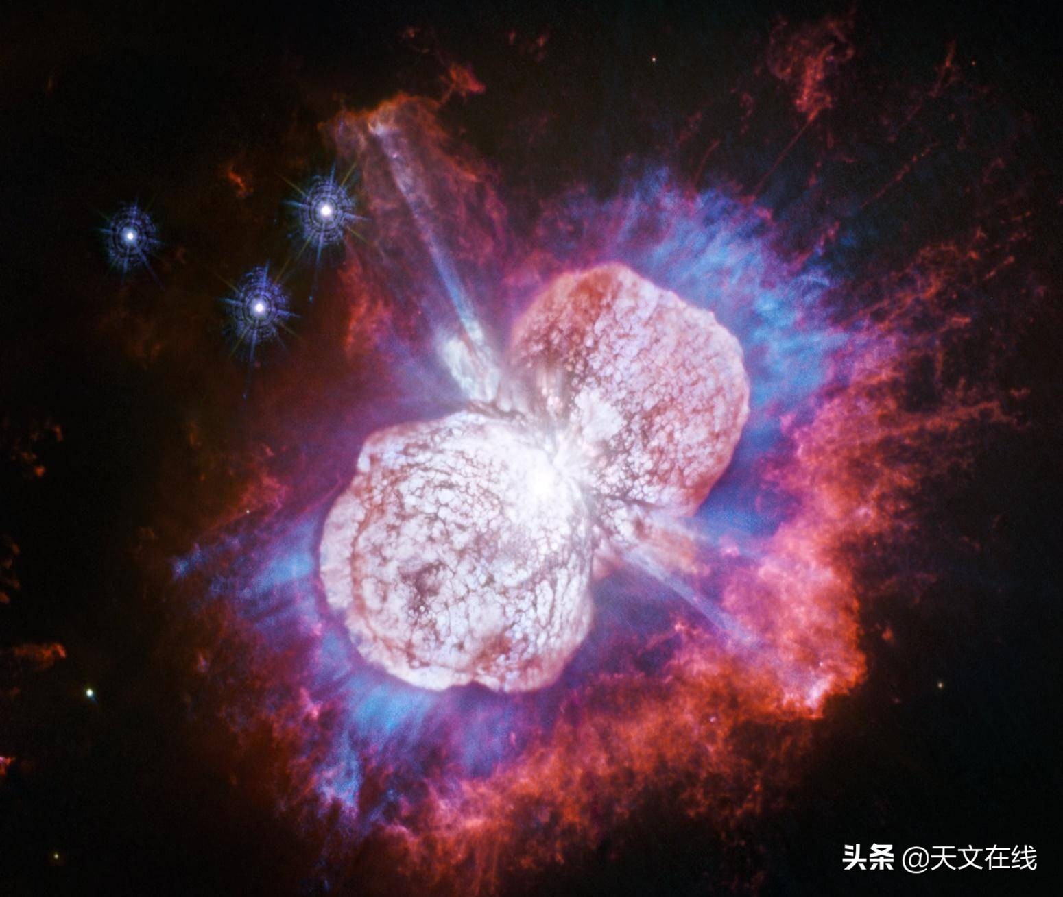 哈勃空间望远镜观察了20多年,终于在2019年7月捕捉到了这一恒星系统的大规模爆发。这个系统名叫海山二,有两个恒星,比太阳亮至少五百万倍。此图中,这个恒星正在发生其已知的猛烈爆发之一。望远镜使用了紫外线,展示了它放射出的物质,发蓝色光的是镁,周围外面一圈红色的是氮。