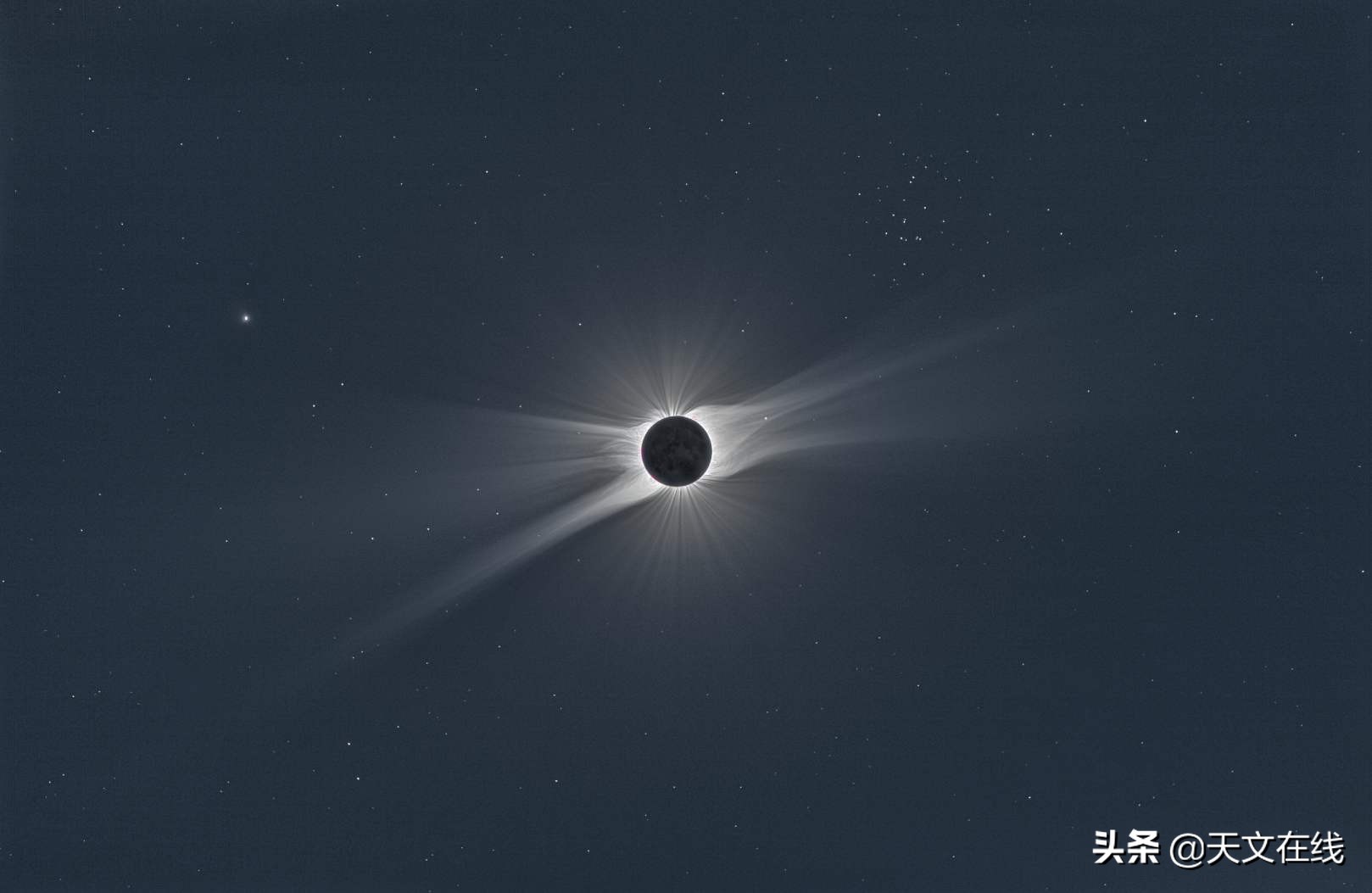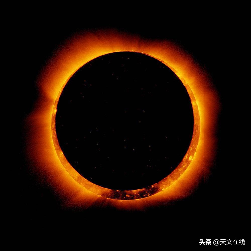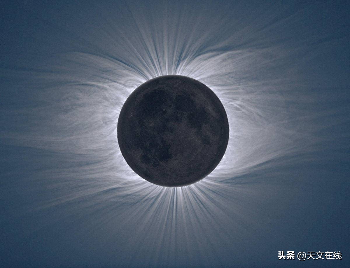 而那里,在这条线上,还有这个东西,这个辉煌的,令人说不清的东西。它看上去就像是用银丝编织出的花环,就挂在宇宙空间中,闪闪发光。那是太阳的外层大气,日冕。图片根本无法显示它的真实面貌。那不只是绕着太阳的一个环或光圈。
