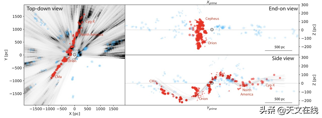 所有的这些关于重新描摹整个银河系的故事,都始于一名叫做凯赛琳•扎克的研究生对于银河系地图的探索。扎克(哈佛)通过多样的地面和空间观测,来绘制银河系恒星温床所的立体位置图。恒星温床所就好像追踪星系表面特征的明亮雀斑一样——如果绘制关于他们的图表,你就能描绘出星系的模样。这三张图从三个方向观察了太阳附近分子云的三维分布(标记@的),标有红点的云就是雷德克里夫波的一员。