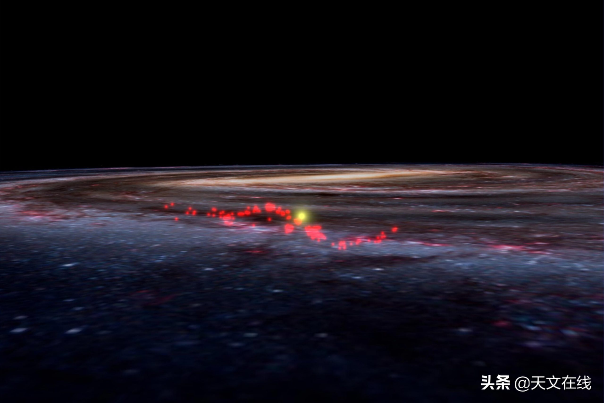 在WorldWide Telescope(万维天文望远镜)软件中,银河系卡通模型中太阳(黄点)旁边的Radcliffe wave(红点)。万维天文望远镜,Alyssa Goodman等