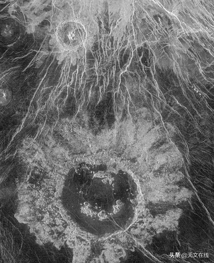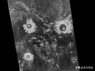 在这张金星的拉维妮娅区域的照片上可以看到三个直径大约37-50千米(21-31英里)的陨石撞击坑。