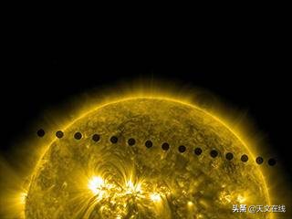 来自太阳动力学观测站的金星凌日的171波长的图像序列,合并在一起展示金星凌日的轨迹。