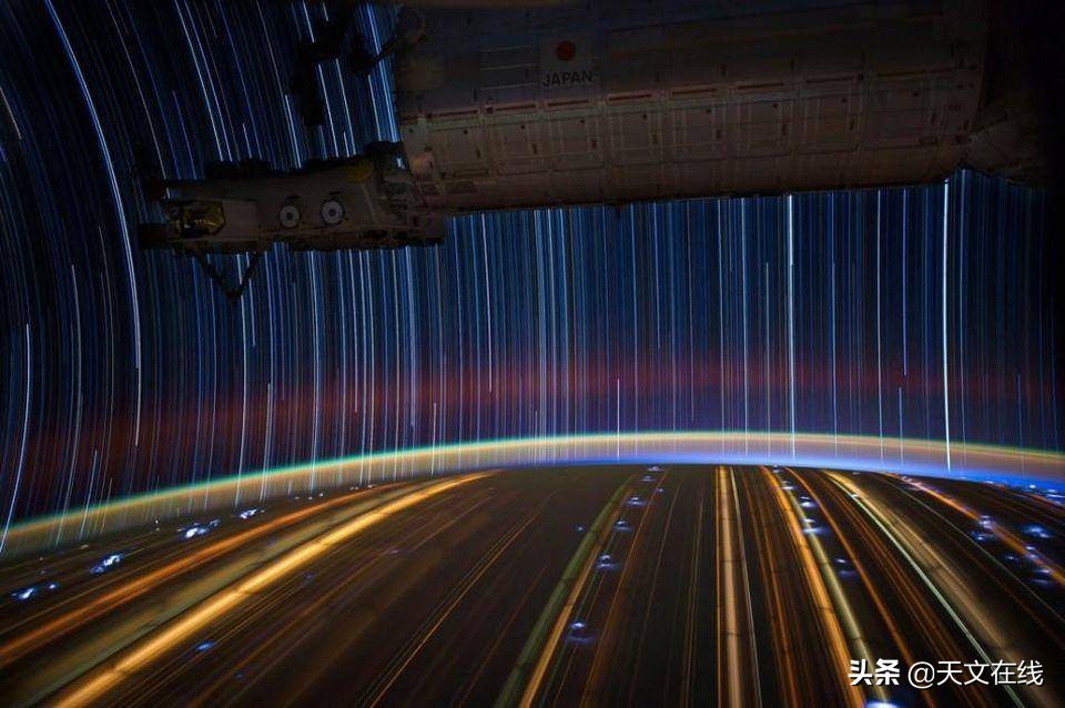 图6. 国际空间站横向飞越地球时,恒星会尾随其后。恒星出现在地球的前景是因为地球大气层的微弱而透明的性质。图片来源: 美国国家航空和航天局/宇航员佩蒂特