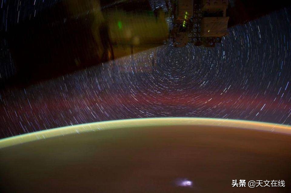 图8.氢元素产生的红色大气光在氧元素产生的绿色大气光的上方,黄色的光辉则是夜晚地球上城市灯光,蓝色的闪电正击打在地球上。星星产生的星轨在最上方。 图片来源: 美国国家航空和航天局/宇航员佩蒂特