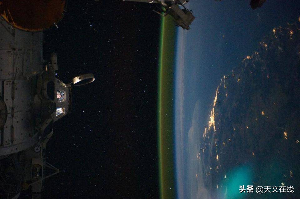 从这个独特的有利位置,可以看到绿色和红色的大气光, 黄色的城市灯光,甚至还能过看到蓝色的闪电。