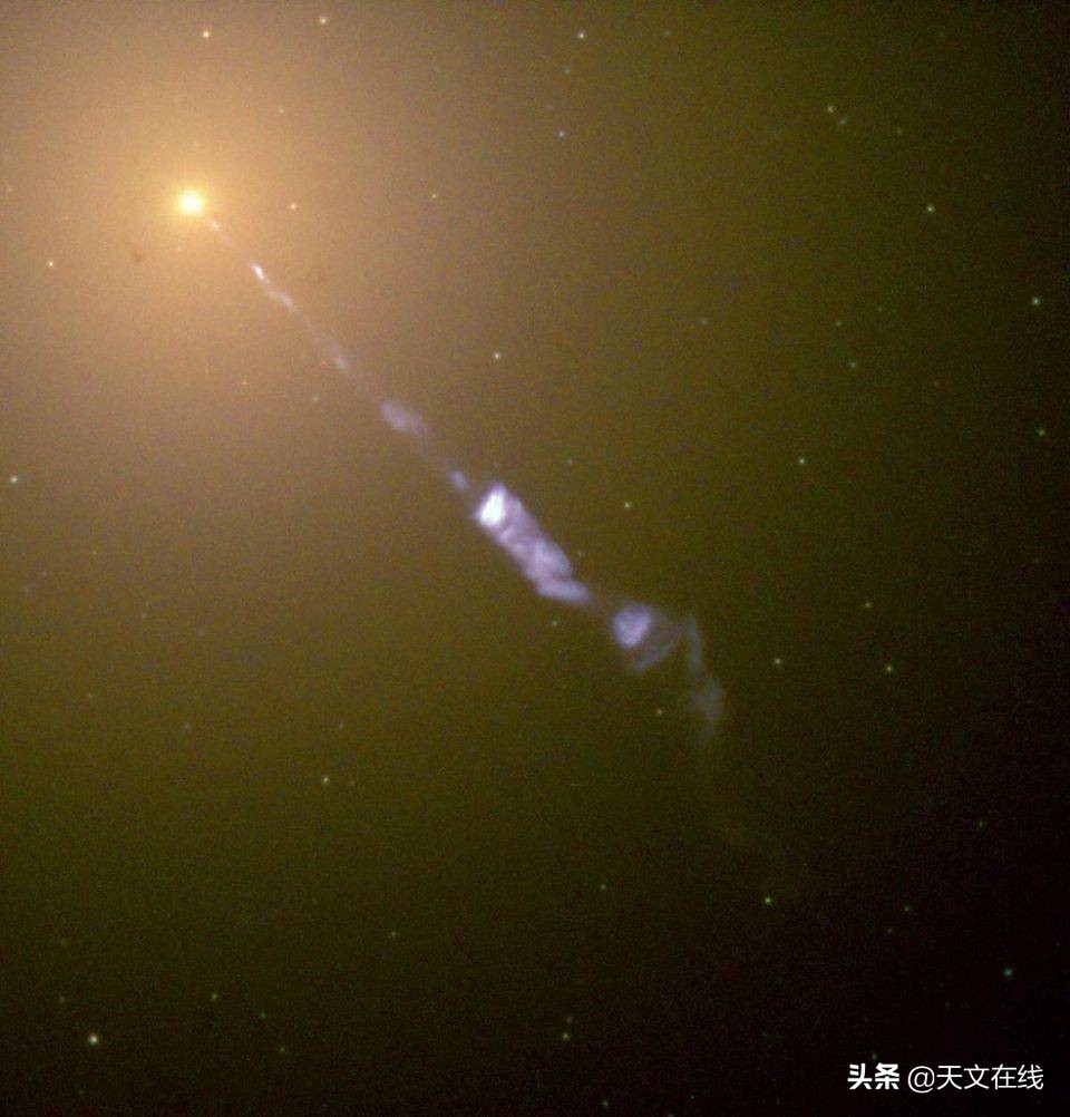 图片来源:美国国家航空航天局和哈勃遗产团队(空间望远镜研究所 / 大学天文研究联合组织),是来自M87星系的由带电粒子加速产生的相对论射流。