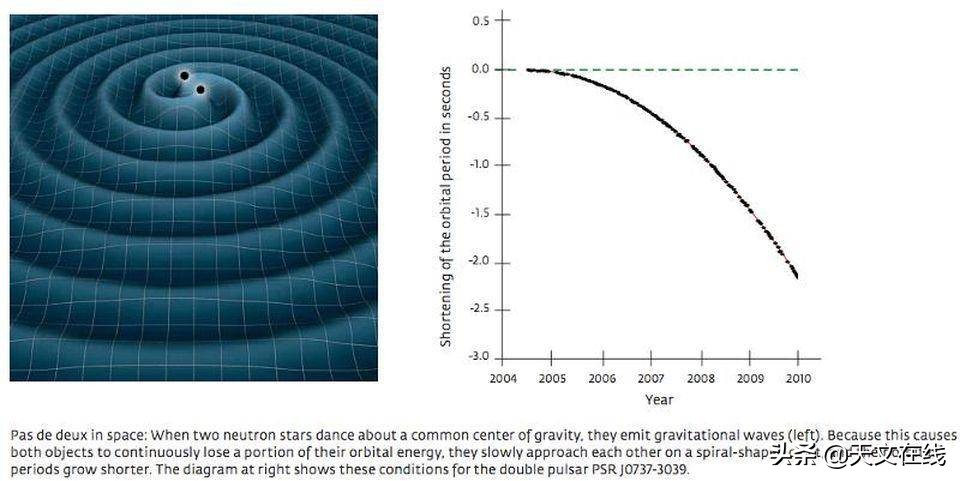 图片来源:欧南台/左. 卡萨达,一颗脉冲星绕着其双星同伴运行,在时空中产生了引力波(或引力涟漪)