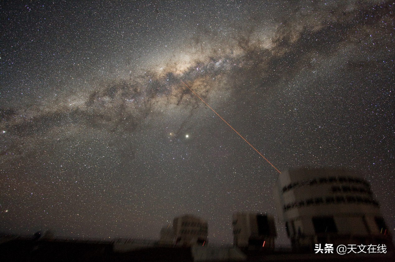 夜晚在巴拉那天文台观测到的银河系中心(图中激光是为天文望远镜设置的引导星)