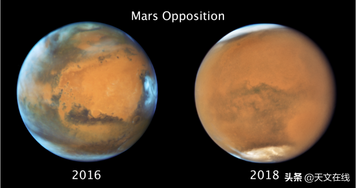 哈勃太空望远镜在2016年和2018年拍摄的火星比较图。在2016年可以清楚地看到其表面特征,但在2018年,大部分表面被朦胧的尘埃所遮盖。(NASA / ESA / STScI)。
