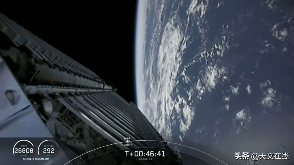 图解:带着SpaceX的“星链二”任务,60颗卫星互联网星座试验卫星在2020年1月6日成功发射入轨。从“猎鹰9号”火箭的二级俯瞰图中可看到星链及蔚为大观的地球背景。(图源:SpaceX)