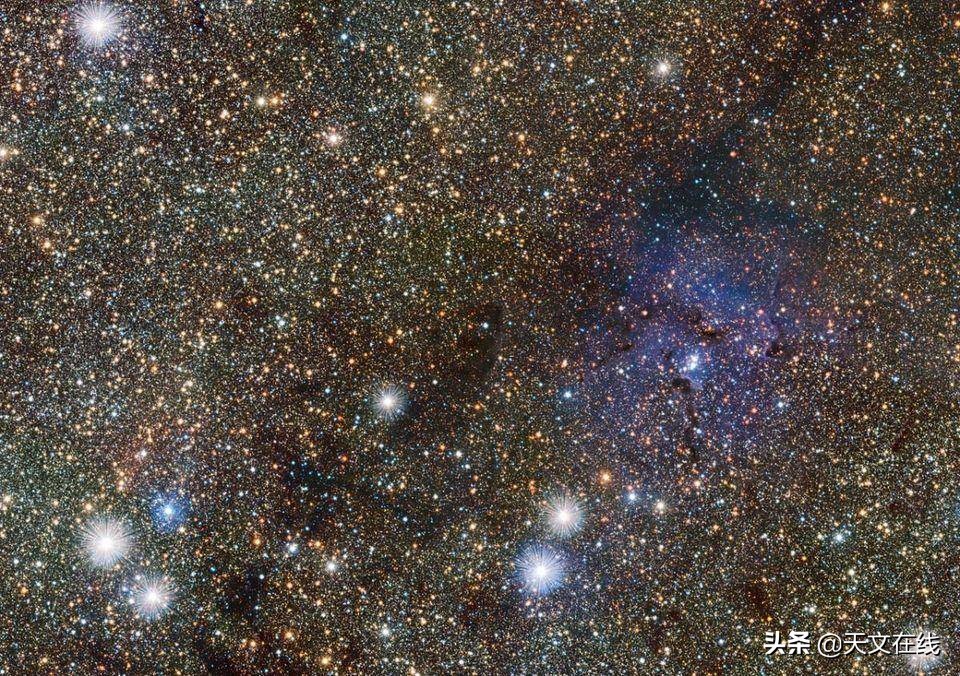 蓝色区域是反射星云:自身不发光,而是反射附近年轻而明亮的恒星发出的光。