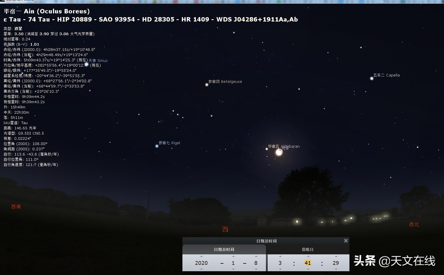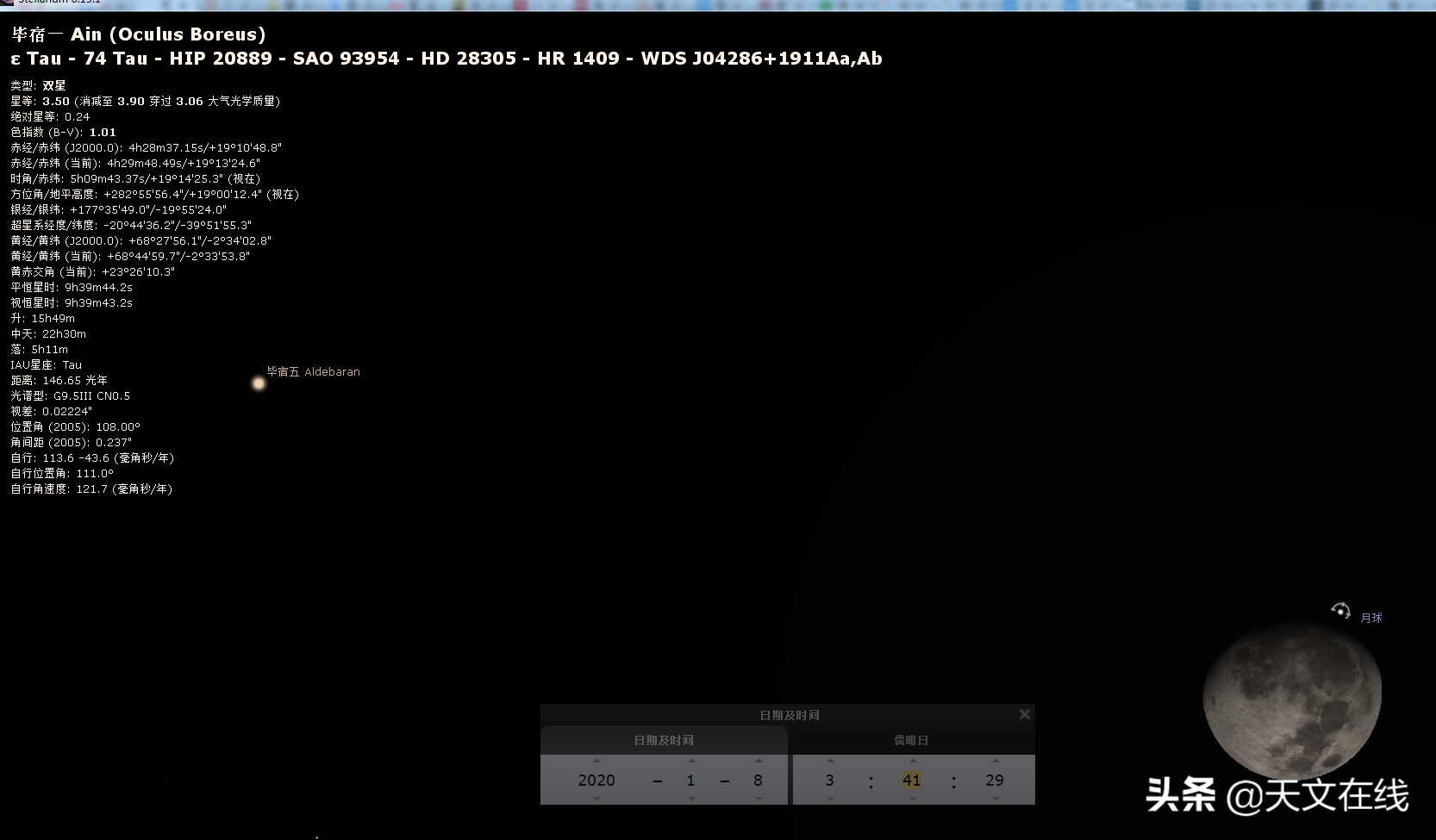 2020年1月8日(星期三)凌晨,农历腊月十四,月掩金牛座3.5等毕宿一,用小型望远镜可以追踪观赏。
