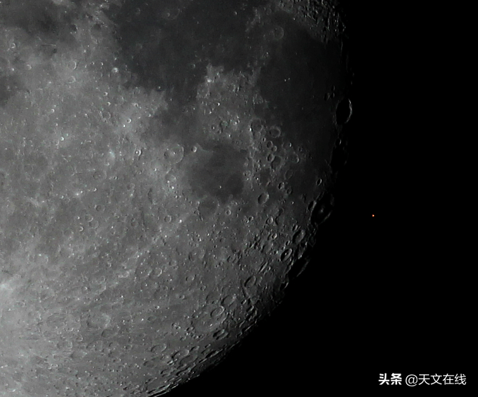 图解:月球掩蔽毕宿五。毕宿五是在月球右方的小红点,在缩图中几乎看不见这个点。
