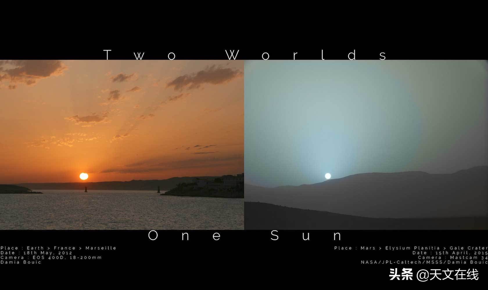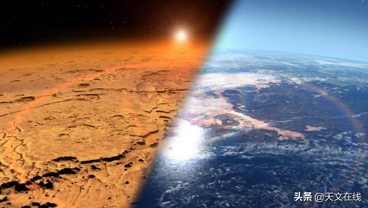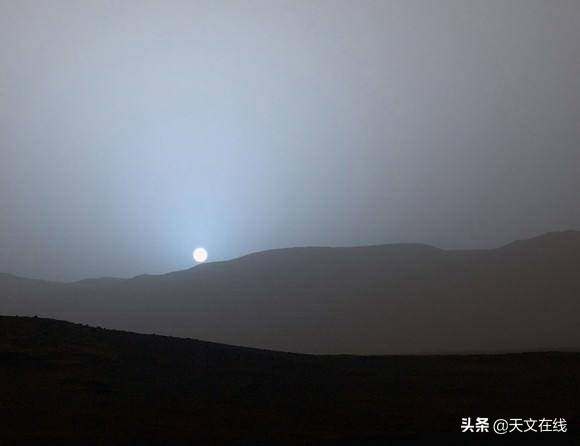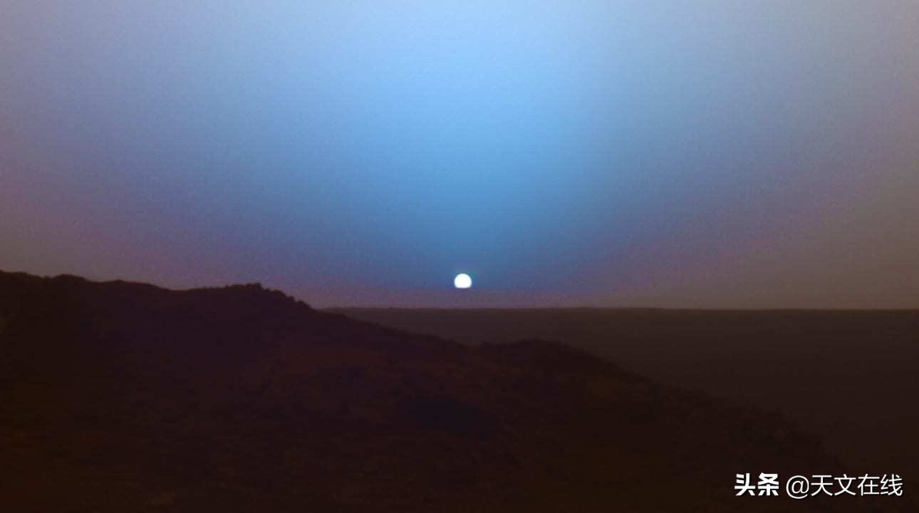 在地球上,来自太阳的蓝光被空气分子散射,并扩散在天空中,形成一个蓝色的树冠。火星的大气层不到地球的1%,因此,我们只能在日出和日落时分,从火星大气(和尘埃)的最大厚度中观察时,才能注意到蓝色。