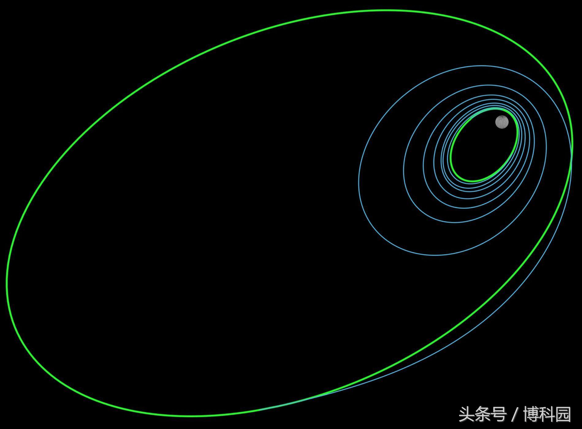这张NASA的图表显示了曙光号太空船环绕谷神星(外层绿色椭圆)的初始轨道和接近最终轨道(中间绿色椭圆)的轨道,蓝色的线表示探测器在中间的路径。图片:NASA/JPL-Caltech