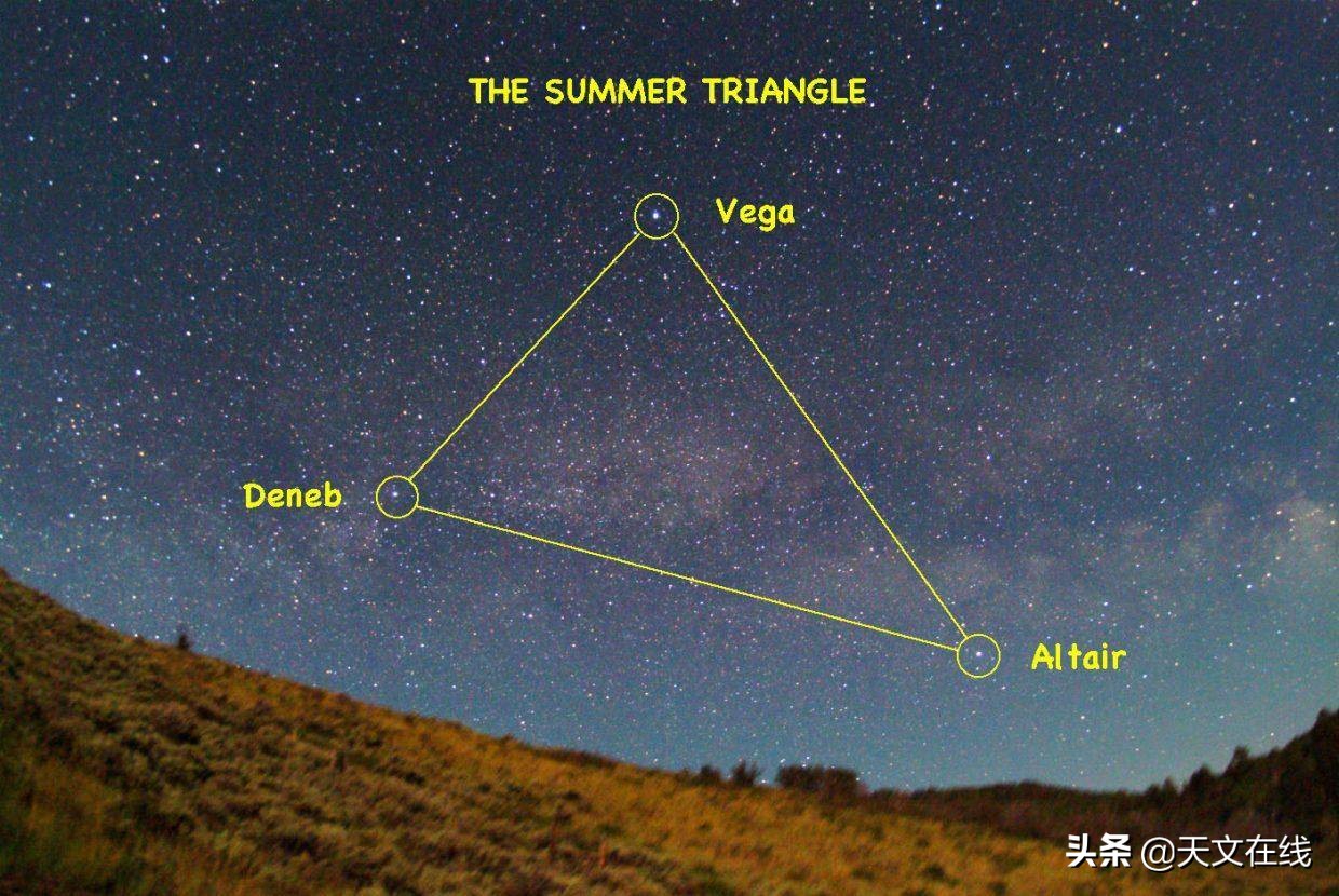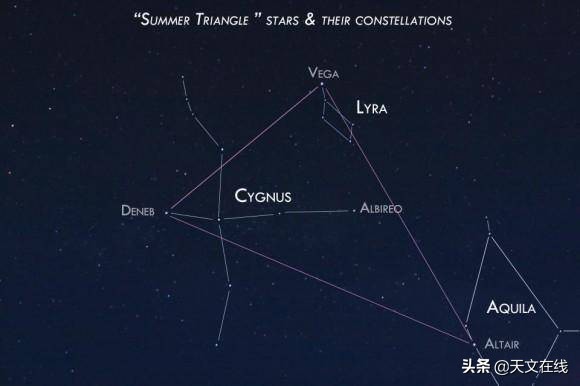 天津四是夏季大三角的三颗星之一。天津四和牛郎星、织女星共同组成著名的夏季大三角,下个月夜晚8点以后会于东方天空完全升起。在北半球暮春的夜晚,你可能要到深夜才能看到整个夏季大三角。牛郎星是这三颗星中最后升起的一颗。你可以在织女星的左下角看到明亮的天津四,它是夏季大三角中最亮的一颗星。