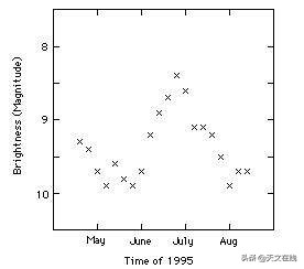 这是一颗美丽的红星,在它稍微亮时我们可以裸眼观测到它,而且它永远不会变得非常暗,它每年都会晚一周达到亮度的最大值,所以会有好几年的时间它的亮度达到最大值时它恰与太阳离得很近,以至于我们无法观测它。