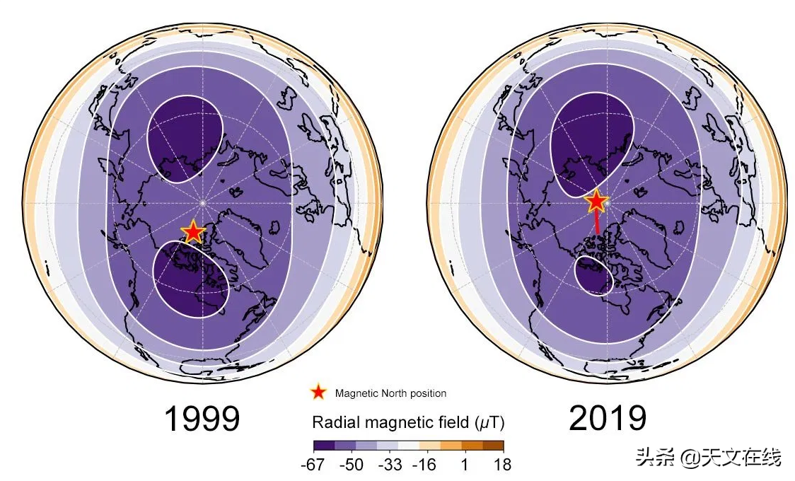 2017年10月,北磁极跨越了国际日期变更线,来到了东半球,此时它足足离开了地理北极点有大约242英里(390千米)。此后,北磁极逐渐南移。可移动速度实在是太快了,导致在2019年,地理学家被迫发布了新的世界磁场模型,那是一张指导着一切的指示图,从指导飞行导航到指导智能手机端的GPS,比预计时间提前了整整一年。