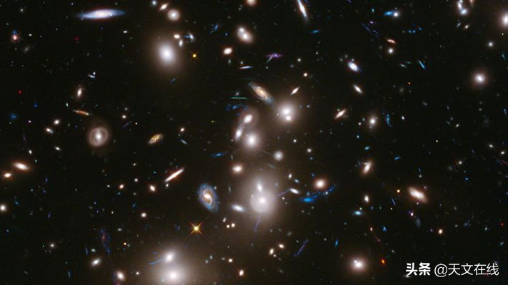 图片来源:美国国家航空航天局/欧洲航天局/太空望远镜科学研究所,图为Abell 2744星系团和引力透镜效应下的背景星系,该图与爱因斯坦广义相对论里的描述相符合。