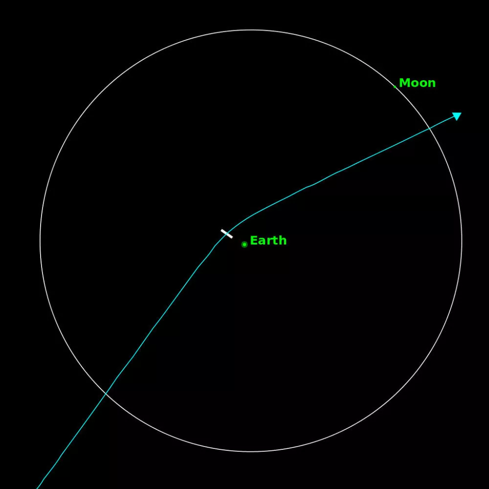 阿波菲斯轨道(白色的线)与地球、月球的轨道示意图。