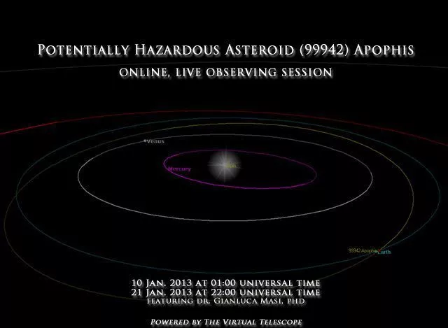 这张虚拟太空图片显示了小行星阿波菲斯的轨道。图片发布于2012年12月14日。