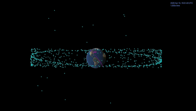 2029年4月13日,天空中的一点微光将越来越亮,越来越快。在某一时刻,它将在一分钟内移动超过满月的长度,并将变得像北斗七星一样明亮。但它可不是一颗卫星或一架飞机——它是一颗直径约340米、名为阿波菲斯(99942)的近地小行星,它将在距离地球表面约19000英里(31000公里)的地方与地球“擦肩而过”,这距离甚至比我们的一些人造卫星还要近。(地球同步卫星距赤道的高度约为36000千米)这可能看起来很可怕,但天文学家们经过对它的轨道十几年的跟踪和计算,得出这颗小行星并不会撞击地球。相反,这是一个千载难逢的机会,可以让科学家们真正了解地球附近的小行星。